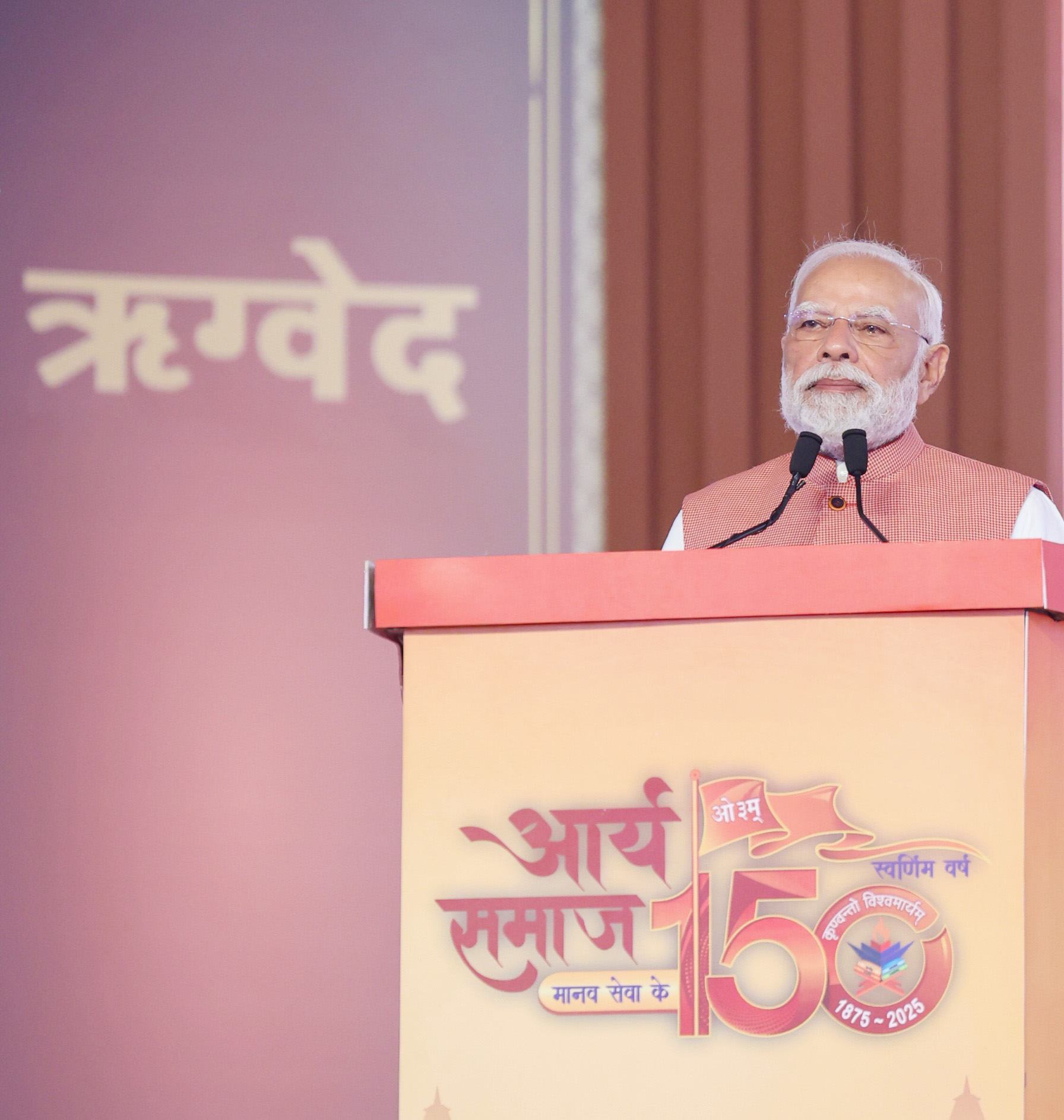 Prime Minister shares glimpses of his address at the International Arya Mahasammelan 2025 at Swarn Jayanti Park (Japanese Park), Rohini, New Delhi.