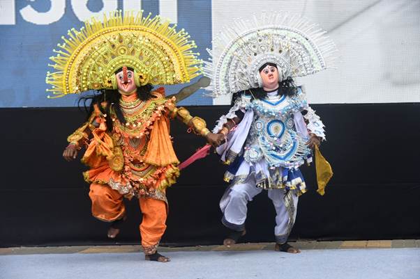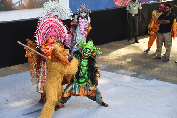 The Royal Chhau Academy staged a dramatic folk play-dance, offering a powerful depiction of good triumphing over evil. The performance vividly recreated the epic battle between Goddess Durga and the demon Mahishasura, complete with appearances by other major deities and striking martial choreography inherent to the Chhau style.